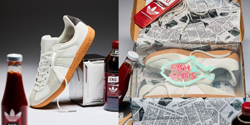 Inside, the insoles keep the theme alive. Think ketchup packet-style graphics layered over clippings from past END. Clothing x adidas projects. The sneaker then rests on top of a french fry-like gum sole, and all of this comes packed in a special edition shoebox that’s designed to look like something you’d get in your local chippie.