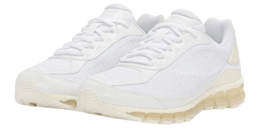 This version lands with a full-length mesh base, detailed with helix patterns on both sides. Smooth leather panels wrap the toe, mudguard and heel, giving it shape without making a scene. Creamy off-white hits on the midsole and heel counter add warmth to the crisp white upper, keeping it from feeling flat.