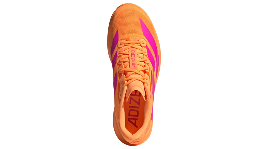 A vivid flash orange upper sets the tone, accented with bold pink hits that create a striking, energetic finish. The design leans on a slim, racing-inspired profile that instantly signals performance. Subtle Adizero branding on the sides and heel cements its place within adidas’ flagship running franchise, while the vibrant palette gives it crossover appeal beyond training sessions.