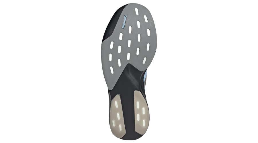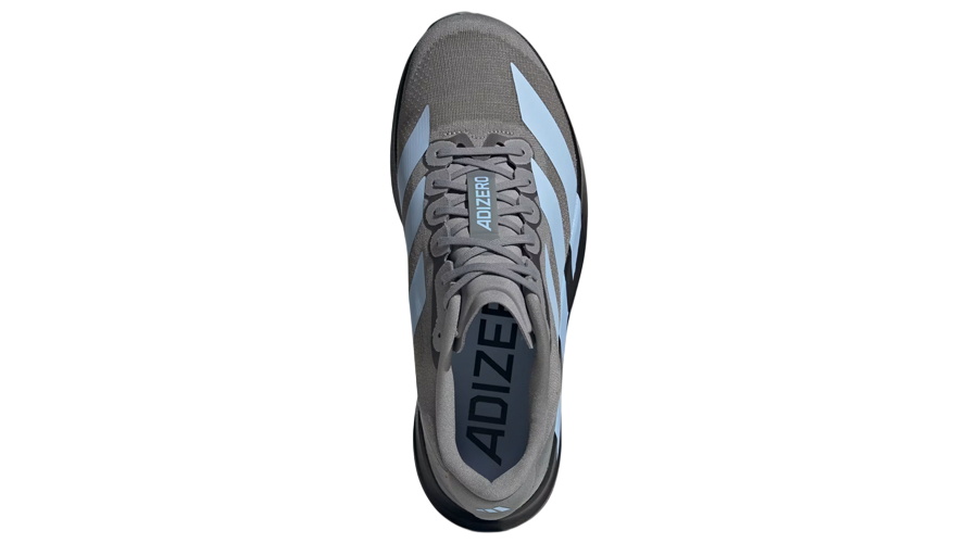 The upper pairs dark grey textile and synthetic panels with oversized glow blue 3-Stripes running across the sides. Branding appears on the instep and sockliner to mark its place within the Adizero franchise, while adidas’ Badge of Sport sits neatly on the heel tab. It’s a look that balances performance heritage with a modern, race-inspired edge.