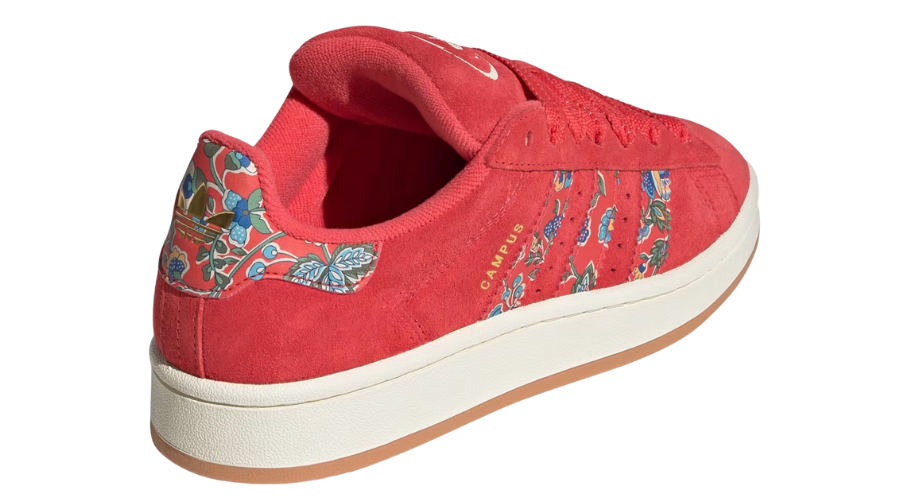 Golden “Campus” text glints off the lateral side, tying in with the cream midsole and gum rubber outsole below. It’s chunky but balanced, vintage but wearable. The floral print doesn’t overpower the design—it enhances it. It’s the kind of detail that catches your eye mid-step without being too loud.