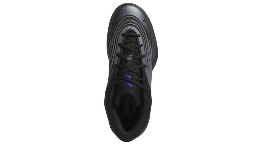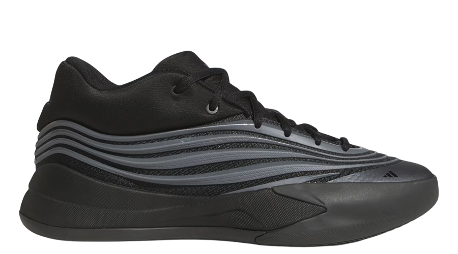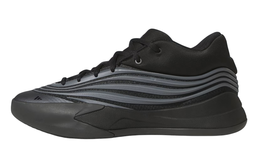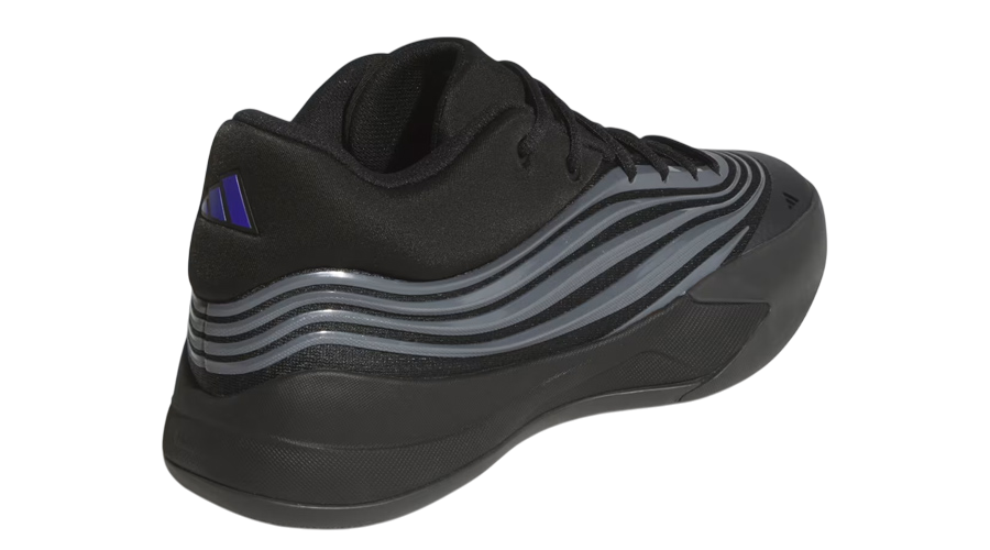 The upper design breaks from tradition. Wavy stripes run along the full length, layered over breathable mesh. It’s sculptural, aggressive, and sets the tone for what this shoe’s about—speed and control. Iron Metallic overlays contrast the black base, while pops of Ludic Blue show up on the tongue and heel branding. It’s subtle flair that nods to Dame’s cool composure under pressure.