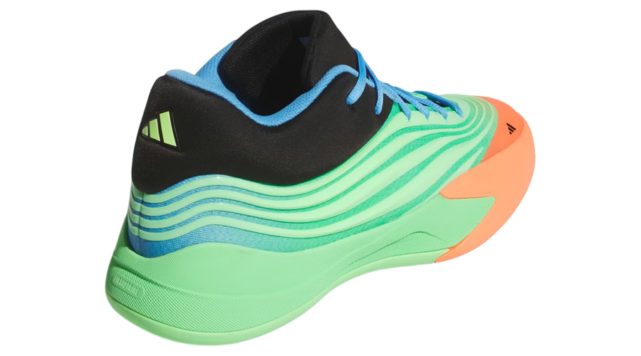 Visually, this one pops. “Lime Burst” floods the midsole and TPU stripes, while the base underlay carries the same electric tone. “Signal Coral” wraps around the toe for contrast, with “Blue Burst” detailing the laces and inner lining. Black finishes on the collar and tongue anchor the look, while Dame’s signature logo on the tongue gives it the stamp.