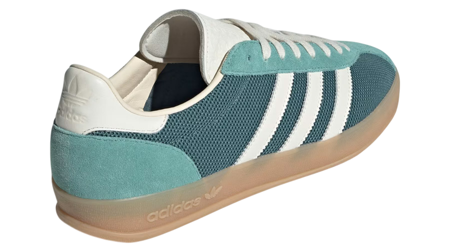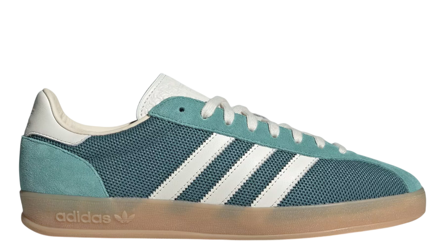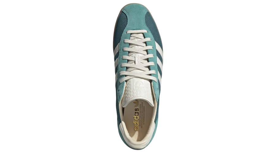 It starts with that upper. A mix of soft suede and open mesh in deep teal tones gives the shoe depth and breathability. The 3-Stripes, cut in contrast off-white, give it that unmistakable adidas look — straight from the terraces, but built for now.