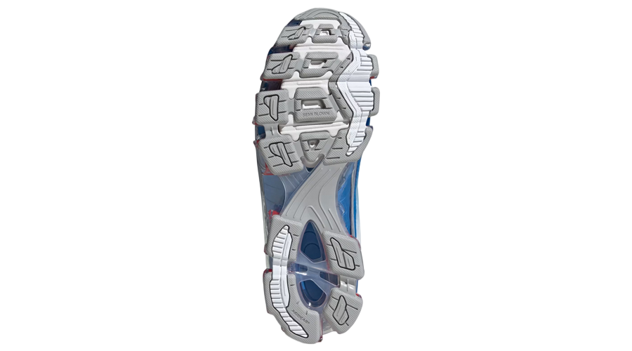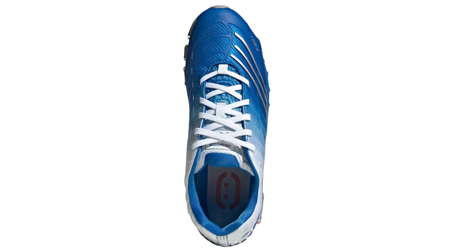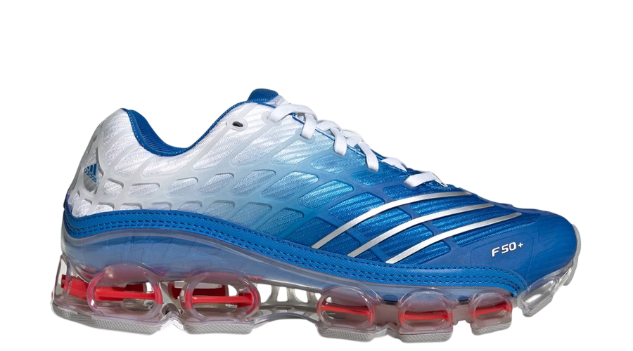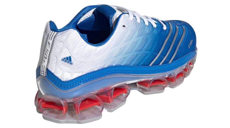 The upper takes cues from the original F50 Spider stability cage. You can see it straight away. Structured. Dynamic. Instantly recognisable. A breathable mesh base keeps things light, while synthetic layers add shape and support. The Blue Bird palette leans into aquatic blues and crisp whites, with subtle red hits adding contrast without stealing focus. The gradient finish across the upper gives the shoe movement, even when you’re standing still.