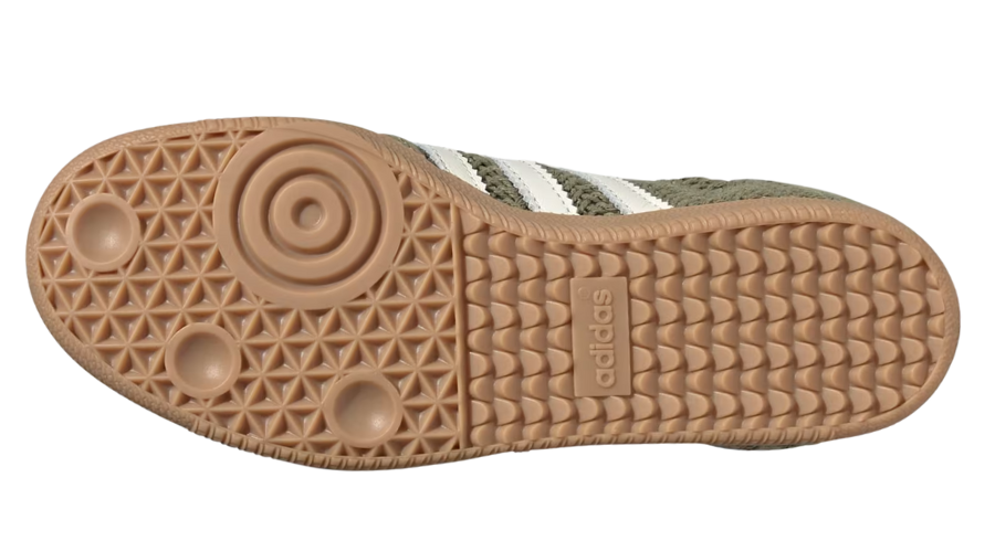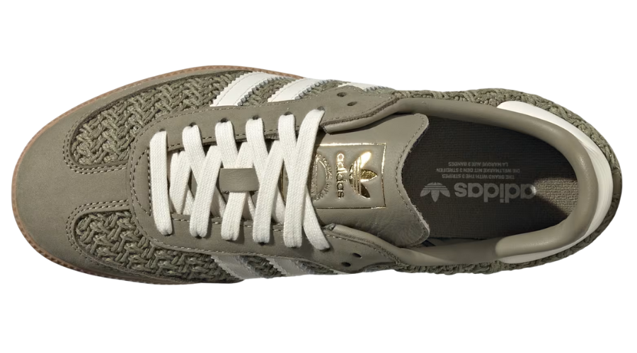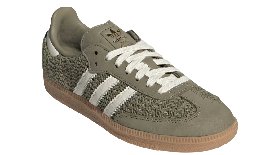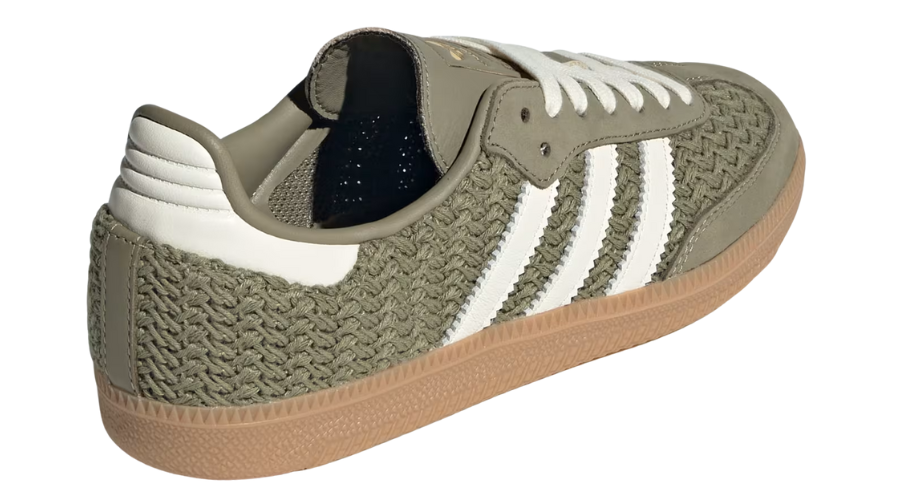 Instead of smooth leather panels, the upper is woven in a rich, earthy green that gives the silhouette a more relaxed and tactile feel. Suede overlays remain intact, grounding the shoe in Samba heritage. The off-white serrated Three Stripes and heel tab bring in subtle contrast without clashing with the natural tone.