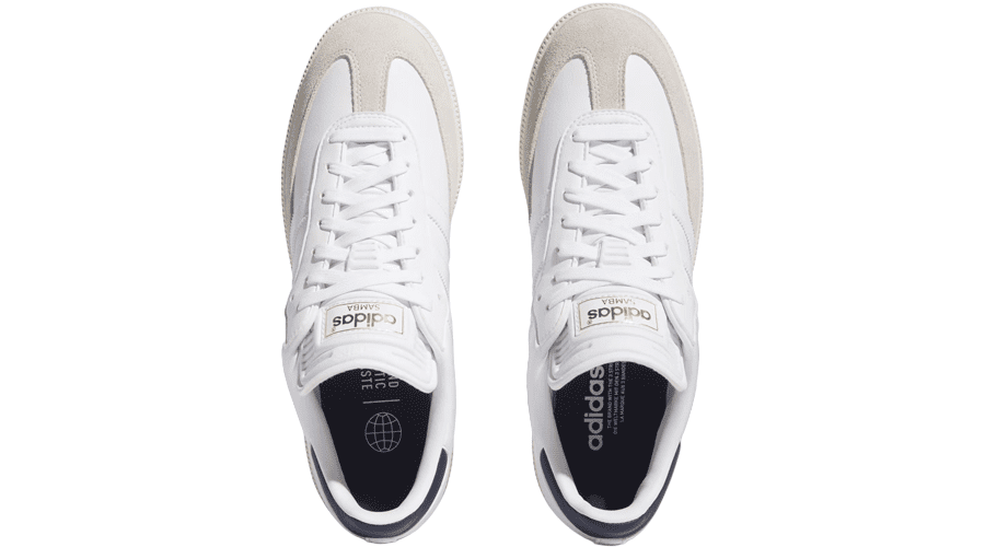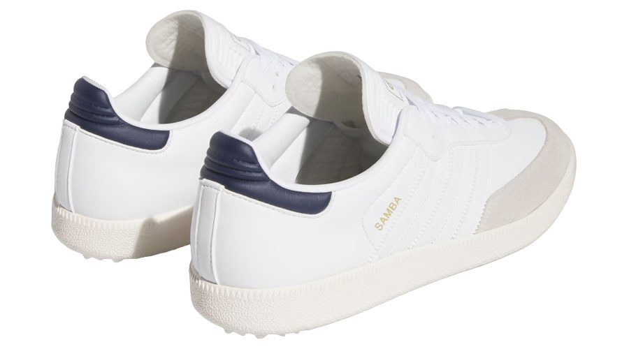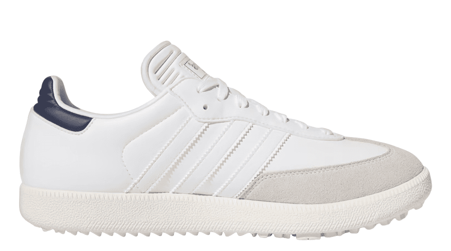 Adidas elevates the experience for golf enthusiasts with the adidas Samba Spikeless Golf “White Collegiate Navy” IE4870. This isn’t just a step forward in golf footwear; it’s a tribute to the Samba’s storied past, reengineered for the golf course.