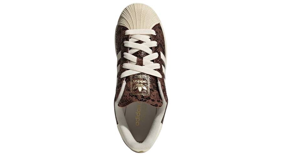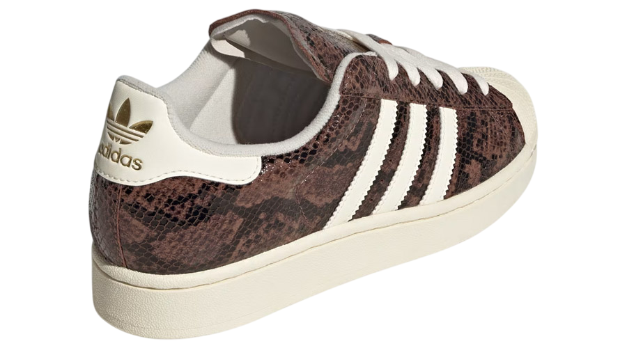 The upper comes in smooth brown leather, overlaid with a snakeskin-inspired finish that delivers depth and character without overcomplicating the look. Classic details remain intact, including the legendary rubber shell toe that defined the Superstar line and gave it its distinct identity. A clean textile lining adds comfort, while the lace closure locks the foot in securely.