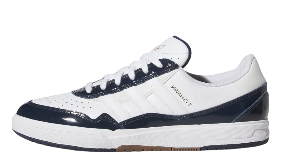 The upper mixes clean white and soft grey mesh with patent leather overlays in deep navy—calling back to Yankees aesthetic and school spirit. Tyshawn’s name hits the side panel in gold, matching the metallic Three Stripes and adding polish to the silhouette.
