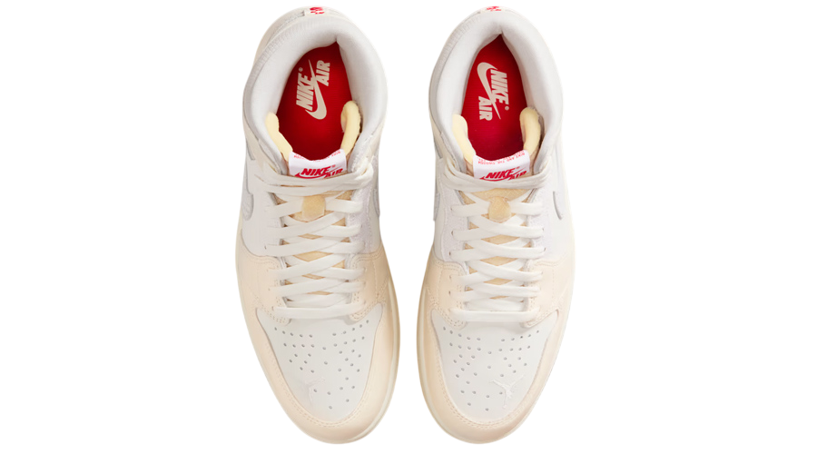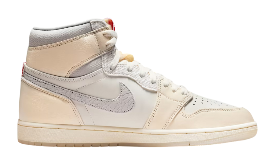 The Air Jordan 1 High “Sail University Red” lands with a look that feels crisp from every angle. The upper leans into soft Sail and Pale Ivory tones, giving the shoe a clean base that works with almost anything. Premium leather panels keep the shape firm, while subtle scaly textures around the collar add character without pushing the design too far.