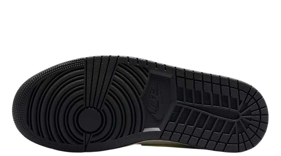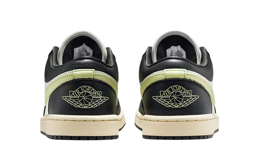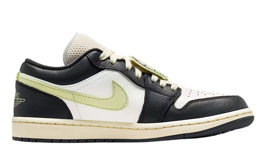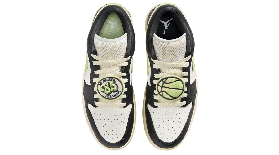 The upper comes in smooth leather, laid out in a clean mix of faint neon green, white, and black. Unlike its taller counterpart, this pair avoids a split-colour arrangement, keeping the presentation consistent across both shoes. Look inside and you’ll spot a playful detail—insoles arrive in mismatched tones, a subtle reminder of Jordan Brand’s knack for storytelling.