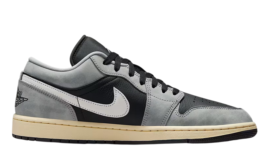 The upper features light grey suede overlays paired with black leather underlays, creating a clean split that feels familiar but fresh. A crisp white Swoosh cuts through the sidewall, providing contrast and balance without overwhelming the look. Underfoot, the slightly yellowed sole gives it that faux-aged feel — a touch of vintage that feels earned, not forced.