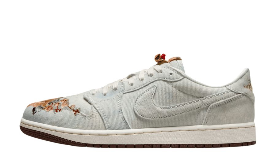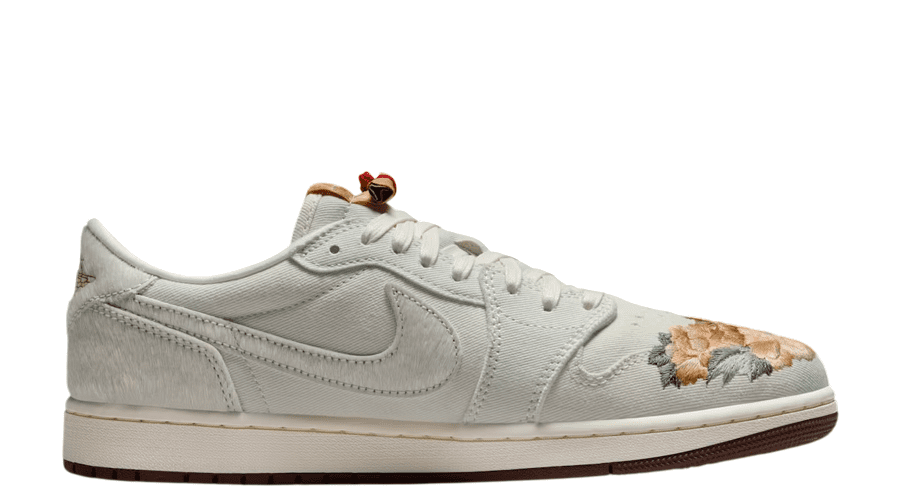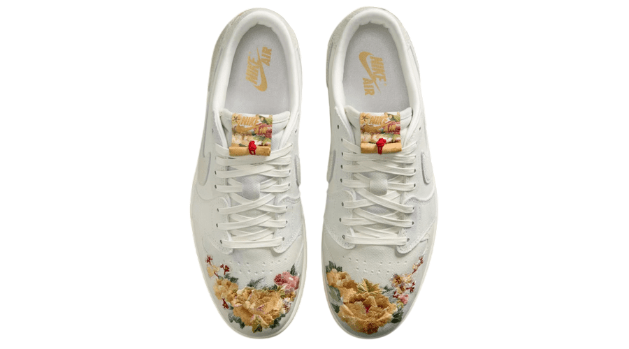 Floral embroidery spreads across the toe box, bold and intricate against the understated upper. Metallic Gold accents sharpen the look, catching light without overpowering the palette. The tongue tag arrives rolled like a scroll, sealed with red stitching. Even the packaging switches things up with a gold-on-gold spin on the classic AJ1 box. It’s thoughtful. It stands out on shelf and on foot.