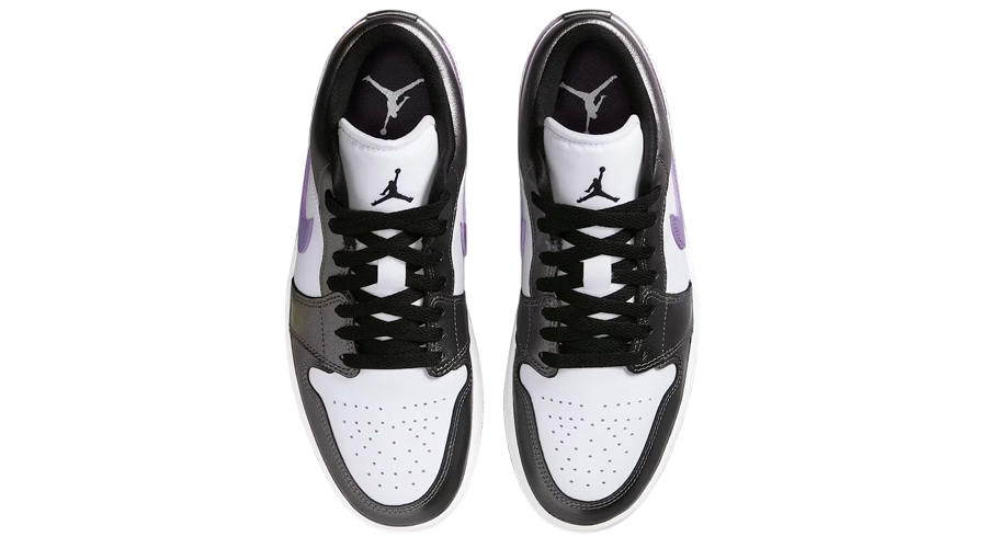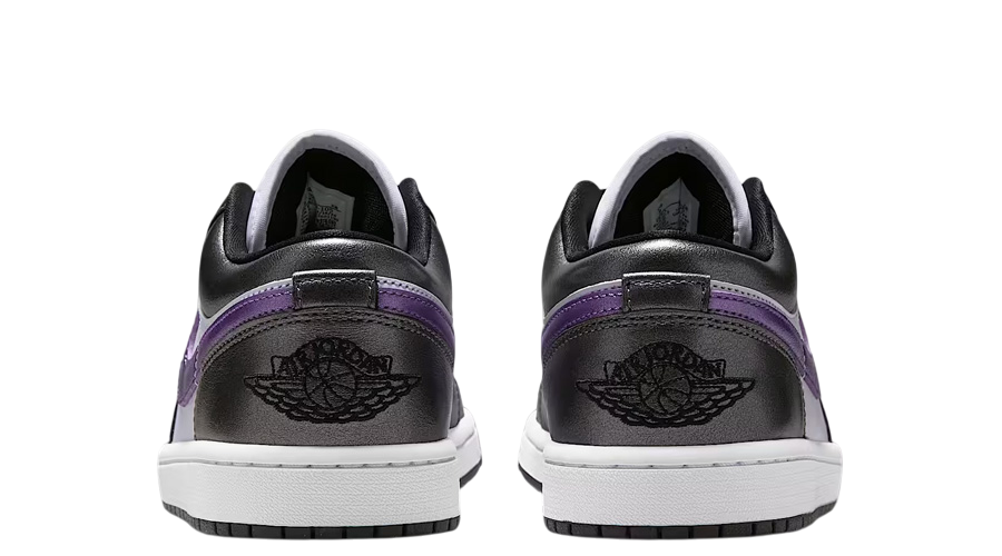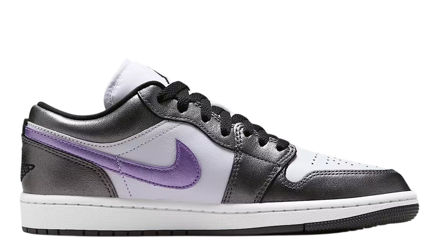 Purple hits dominate the upper, layered over smooth leather and finished with a candy-like gloss across the Swoosh and heel. These high-shine touches create just the right amount of pop without tipping into overdone territory. They mirror the reflective treatments seen on the Air Jordan 1 Mid of the same theme, though this Low version keeps things slightly more stripped back.