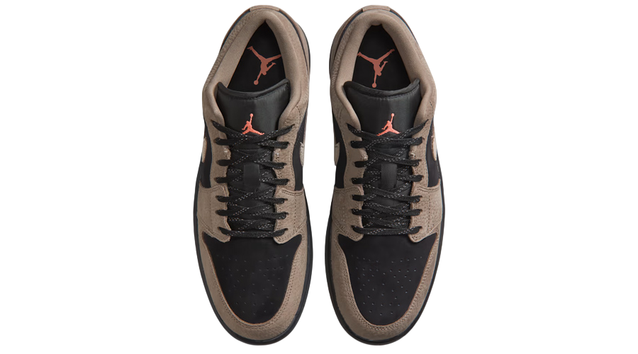 The upper pairs tumbled leather overlays with a black leather base, giving the shoe texture and depth without overdoing it. The contrast works well. It feels balanced. Subtle hits of Light Wild Mango on the Jumpman logos at the tongue and insole add a flash of colour that lifts the whole design. Small detail. Big effect.