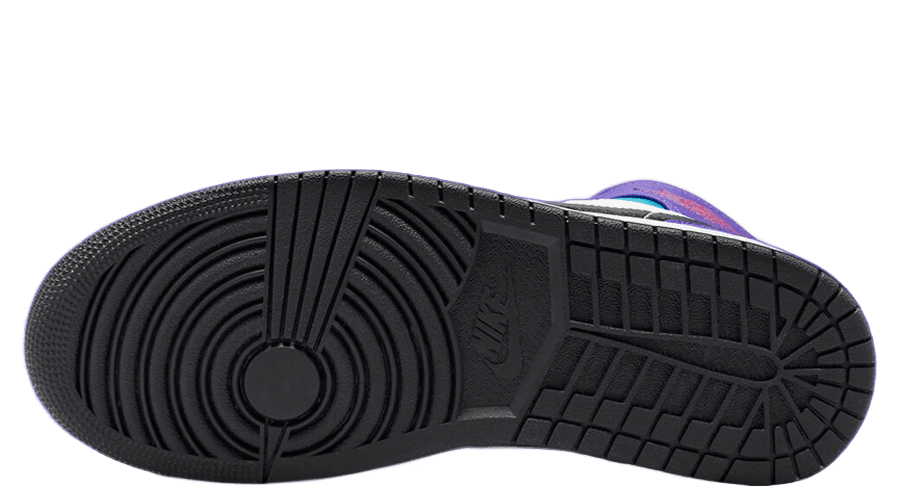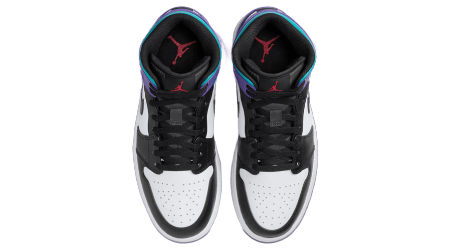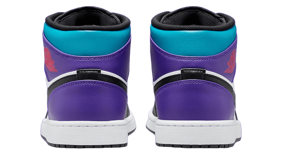 Moving to the back, the sneaker takes a daring turn with vibrant purple on the ankle flaps and heel counter, replacing the usual red highlights of past models. This grape-like colour brings a lively pop to the shoe. It’s complemented by a red Jordan Wings logo on the purple collar overlay, adding an eye-catching twist to this Mid variant.