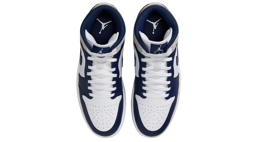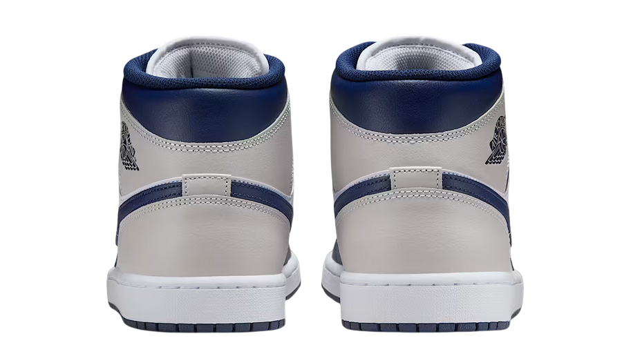 Midnight Navy wraps around the forefoot, tongue, and ankle collar, framing the crisp white leather base in contrast. The Swoosh comes dipped in Neutral Grey for an added layer of depth, and the Wings logo on the lateral ankle adds that extra bit of heritage flair. Every element nods to a classic formula—updated for daily wear.
