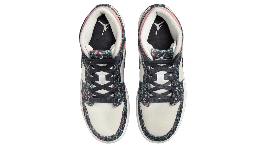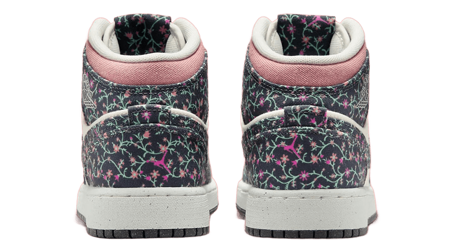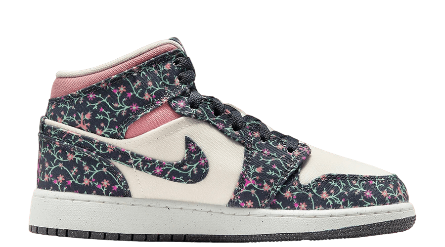 The creativity of the Air Jordan 1 Mid SE GS extends to its base layers. Here, the shoe takes a subtler turn, with off-white and muted pink hues that provide a gentle contrast to the vivid floral overlays. This choice of colours ensures the sneaker remains visually appealing without being overpowering, striking a perfect balance between bold and understated.