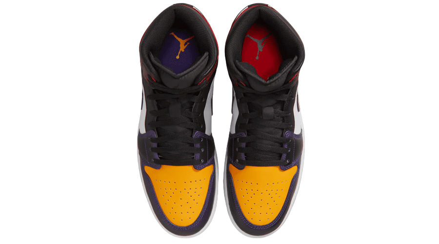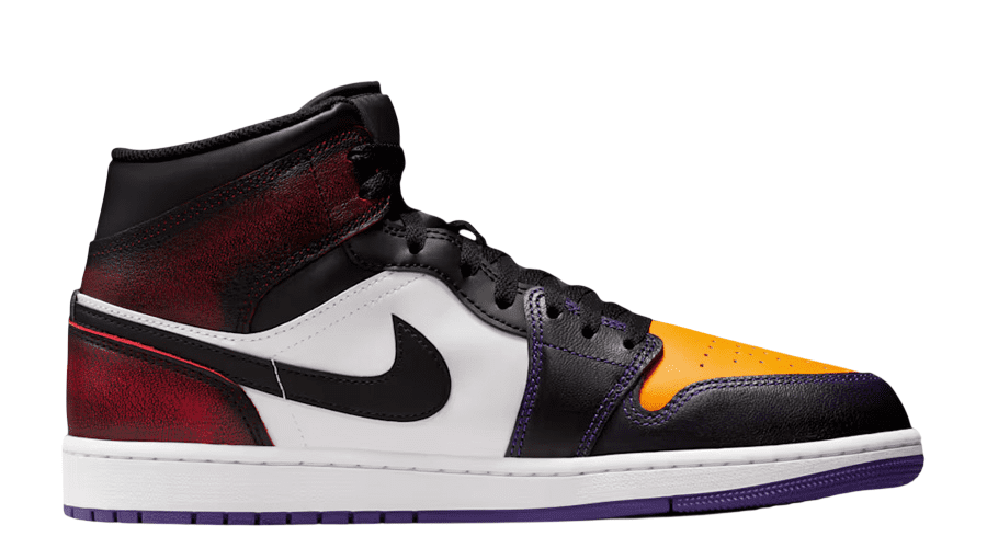 At first glance, the split personality stands out. Purple and gold accents nod to LA. Black and worn red tones reference Chicago. The mix feels deliberate. Slightly chaotic. Completely on brand for the Air Jordan 1 legacy.