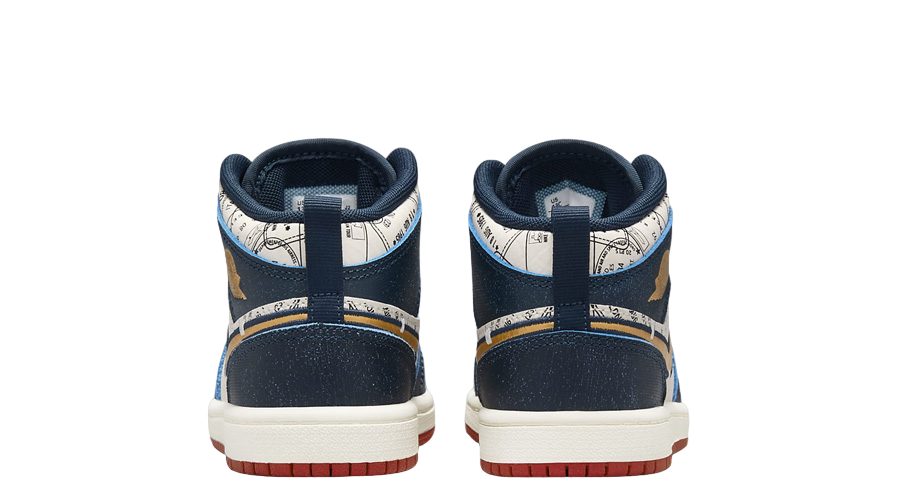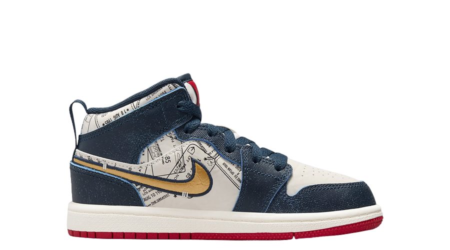 The Air Jordan 1 Mid SE PS “Take Flight” FN1352-400 draws its inspiration from the world of travel, specifically echoing the design cues of passports and the stamps collected by Michael Jordan on his international tours. This model comes with a distinctive luggage tag, which can be used as an accessory on the sneakers or on travel bags, linking the theme of exploration and movement.