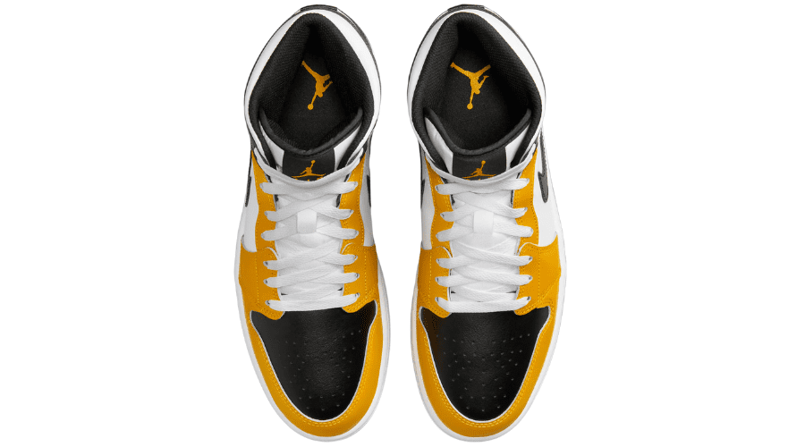 To add depth and contrast, black takes center stage on the toe box, collar overlay, heel overlay, Swoosh, tongue tag, and sock liner. The interplay of yellow ochre and black creates a dynamic visual impact, showcasing the versatility of the Air Jordan 1 Mid silhouette.