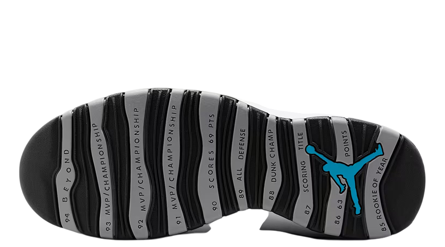 This retro stays faithful to the original blueprint. The smooth leather construction and distinctive striped lace loops remain intact, offering the same structured fit that once supported MJ on the court. Underfoot, the outsole retains its unique storytelling element — each groove marks one of Jordan’s career milestones up to that point, from scoring titles to championships. This design detail makes the AJ10 stand apart from other models in the Air Jordan line, turning the sole into a historical record.