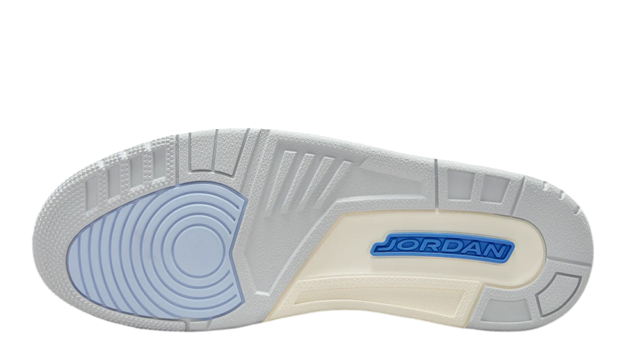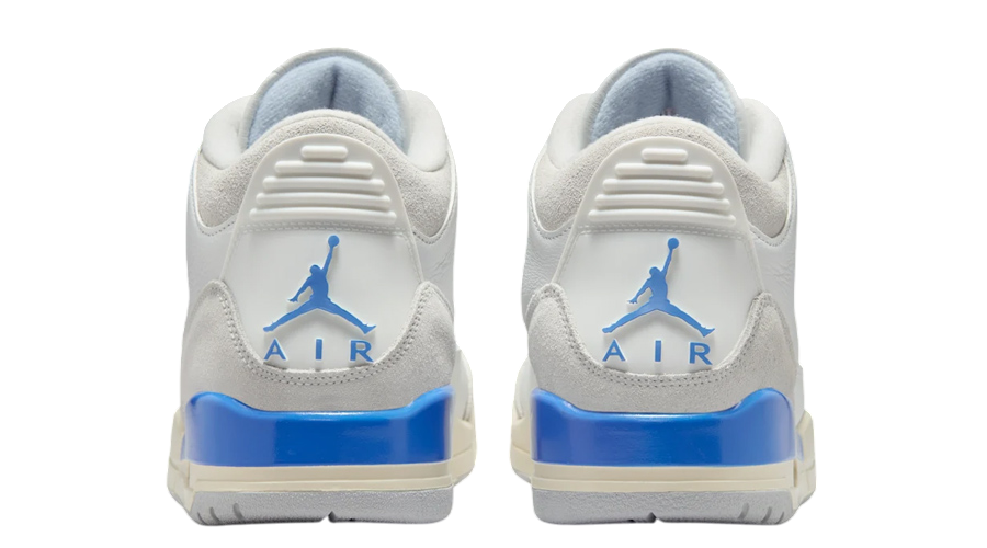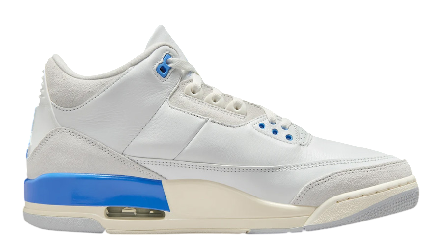 This special edition leans into the iconic UNC colour scheme, with a crisp white leather upper contrasted by soft grey suede overlays on the toe, eyestay, collar, and heel. Unlike traditional AJ3 releases, the usual elephant print is absent, giving this pair a cleaner, more refined look. Blue accents add a pop of colour, appearing on the midsole, Jumpman branding, and TPU heel tab.