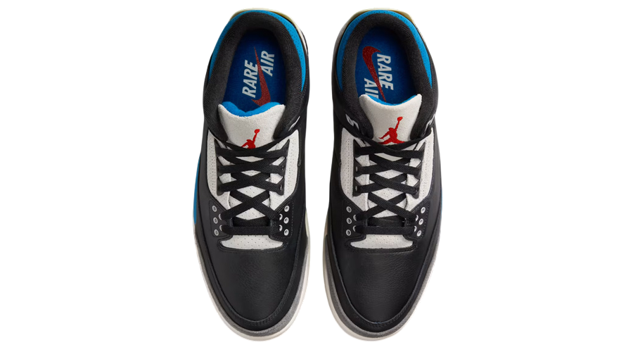 The Air Jordan 3 “Rare Air” brings a bold remix to a heritage favourite. Inspired by imperfections found on early Jordan samples, this upcoming release flips the script on traditional AJ3 details. Gone is the iconic elephant print—Nike replaces it with soft grey suede overlays that give the upper a sleeker, more refined look. Premium black leather covers the base, with hits of Military Blue on the eyestays and inner lining. Together, the colours deliver a sharp contrast that doesn’t stray far from the Jordan brand’s roots.