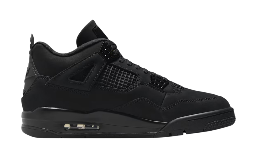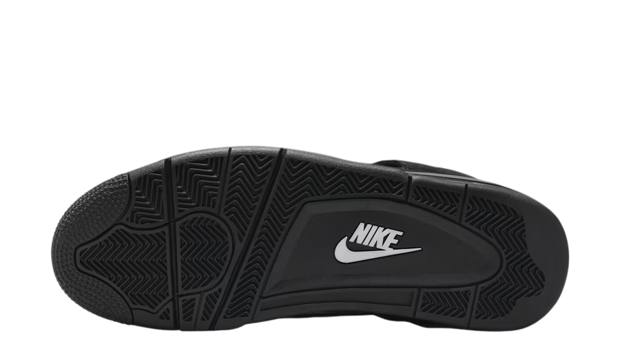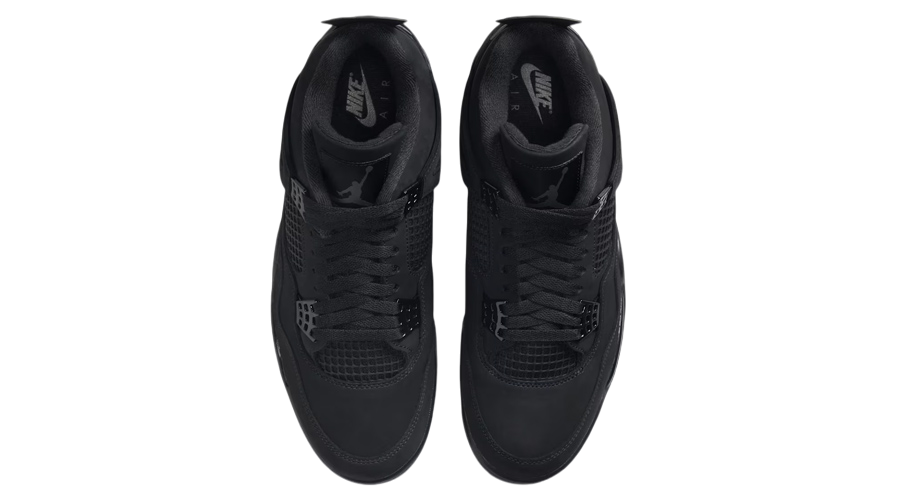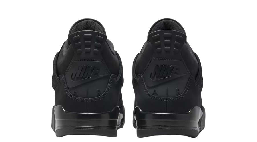 The tongue carries a tonal Jumpman, while the heel switches things up with a glossy blackout Nike Air hit. It’s a small shift in texture that adds interest without breaking the blackout theme. The shape stays true to classic AJ4 build cues, including the moulded eyestays and breathable mesh-style panels that old-school fans will recognise instantly.
