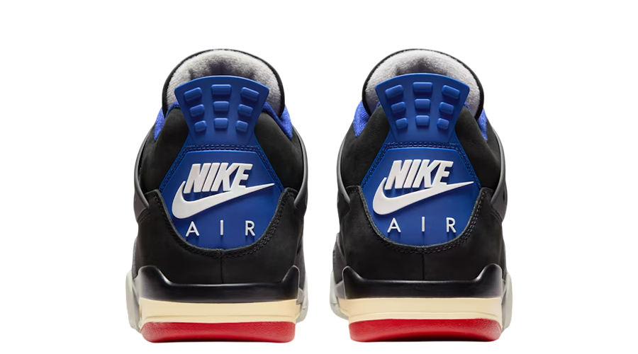 Black nubuck covers most of the upper, with a soft suede overlay reinforcing the toe box. Red eyestays, blue lining, and coloured accents on the heel and outsole break up the dark base with subtle contrast. Under the removable tongue patch, you’ll either find silver “Rare Air” text—or, if you’re lucky, gold. Nike produced only a small number of gold-tagged pairs, so some releases are rarer than others. You won’t know which you’ve landed until you peel back the patch.