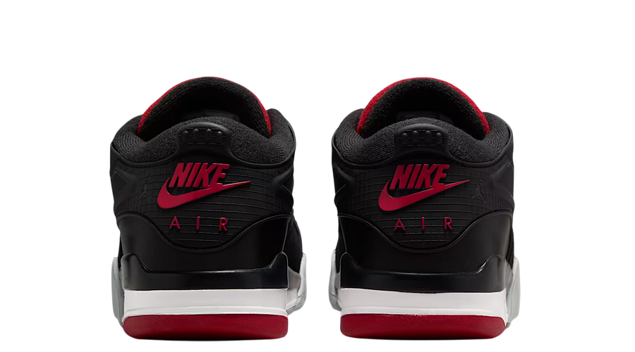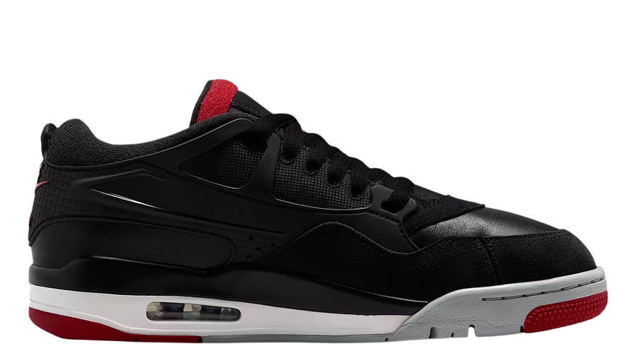 Black dominates the upper, constructed from a blend of materials that shift from matte to textured, giving the shoe depth without overcomplicating it. Red accents hit the tongue lining, Jumpman tags, and “Nike Air” branding on the heel, anchoring the pair in familiar territory. Underfoot, the outsole nods directly to the OG “Bred” with that unmistakable mix of grey, red, black, and white.