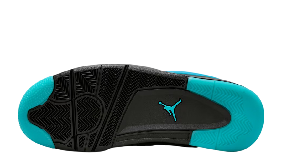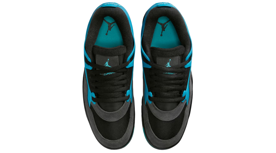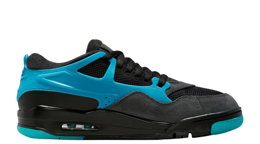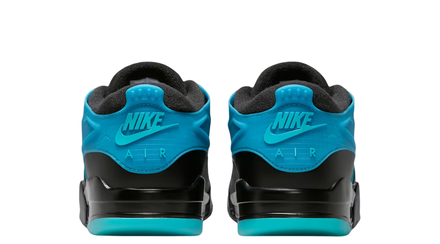 The upper carries a deep jet-black base that sets the tone for the electric “Gamma Blue” details to shine. It’s a sharp contrast that instantly catches the eye. TPU cages wrap the sides and heel, giving structure while hinting at that familiar AJ4 shape. What sets this pair apart is its glow — literally. Under low light, the luminous accents flip the look completely, revealing a vibrant edge that brings a two-in-one feel to the design.