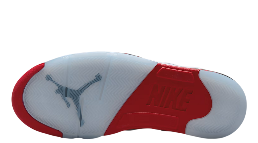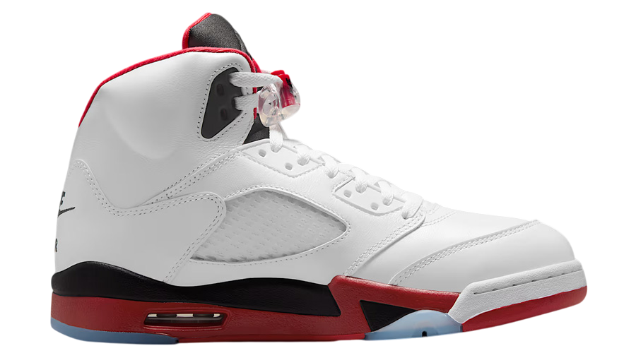 Signature details remain firmly in place. The shark-tooth midsole graphic, inspired by WWII fighter planes, cuts through in black against the vivid red midsole. Translucent mesh panels on the sidewalls keep airflow in check, while the reflective lace lock system offers secure customisation on the move. Underfoot, visible Nike Air cushioning delivers the same lightweight comfort that defined the AJ5 from hardwood courts to city streets. Icy rubber sections on the outsole add durability and grip while enhancing the classic finish.