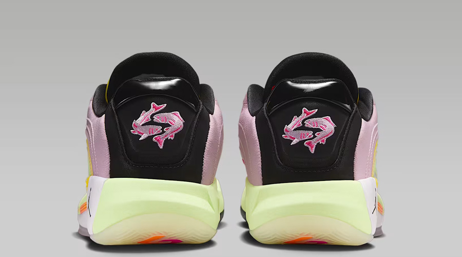A standout detail sits at the heel, where Luka’s signature logo is transformed into a pair of embroidered fish, swimming nose-to-nose. It’s a subtle nod to his downtime and a clever spin on his personal branding. There’s also a translucent outsole underfoot, complete with fishing lure graphics and bright hits of volt and orange that tie the whole concept together.