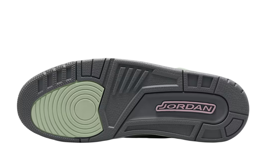 Colour hits are subtle but well placed. Aura green lands on the Jordan 4-style wings, adding a light, seasonal touch. Iced Carmine appears on the lace lock and heel branding, bringing a soft contrast that lifts the overall look without overpowering it.