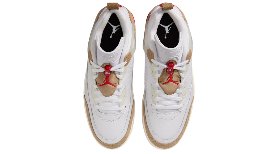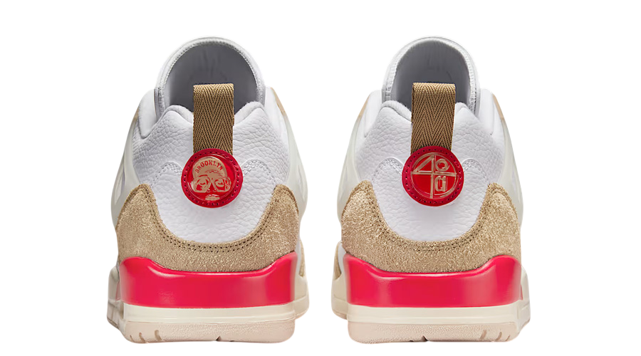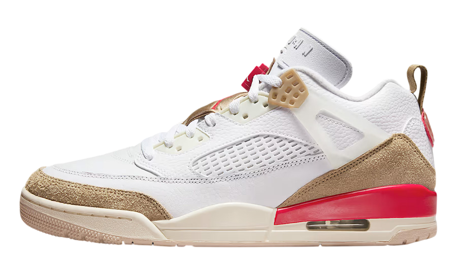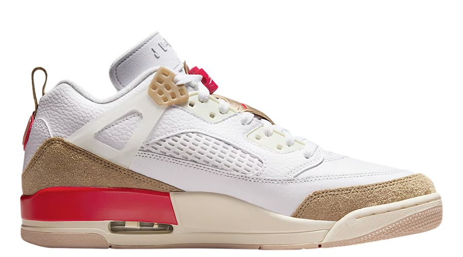 The Air Jordan Spizike Low “Desert Camo” puts a fresh spin on a hybrid classic. Drawing visual cues from the Air Jordan 9’s luxury makeover, this version brings in a premium mix of textures and tones. White leather covers most of the upper, while golden overlays wrap around the mudguard to create a bold contrast. Red suede appears across the back end, giving this colourway a warm, dusty finish that lives up to its desert name.