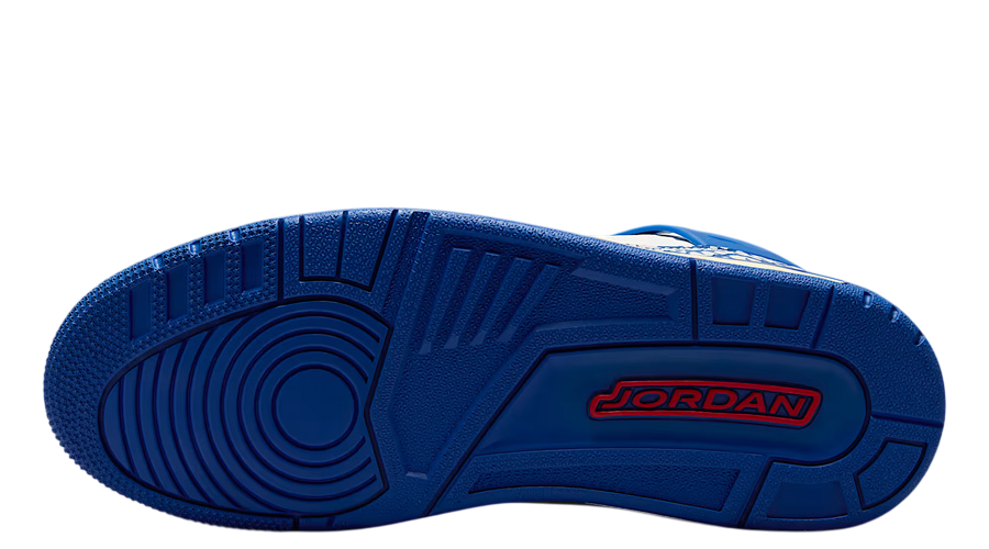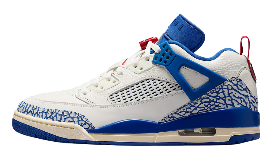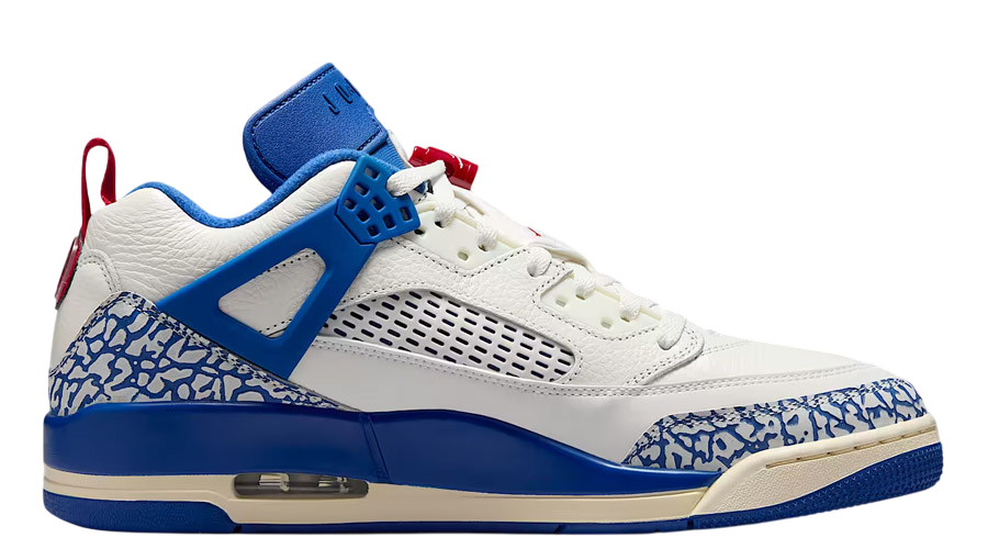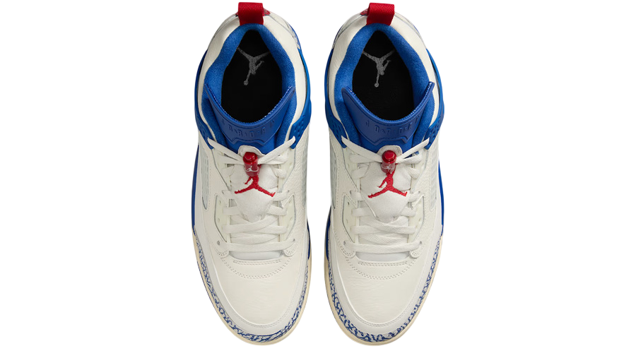 The Spizike itself pulls design cues from five different Jordan models. You get the wings and toe from the 4s, the eyelets from the 5s, the tongue from the 6s, and traces of the 3 and 20 in the mix too. That blend sounds wild on paper, but it holds together, especially with the blue overlays locking in the whole upper against a clean white base.