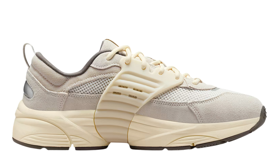 The upper combines breathable mesh with soft suede overlays, giving the shoe flexibility, structure, and a premium finish. A muted cream and light brown palette sets the tone, while subtle silvery accents at the heel add a surprising twist. Pull tabs on the tongue and heel enhance practicality, making it easy to slip the shoe on and off while reinforcing its utilitarian feel. The sculpted midsole carries lightweight foam cushioning, ensuring each step feels smooth and supported.