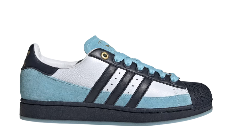 The deeper navy areas—stripes, midsole, backtab, and the famous shell toe—ground the whole shoe. Metal eyelets bring in a small premium touch that fans of the Superstar line will appreciate. It’s a mix that feels simple but still carries character.