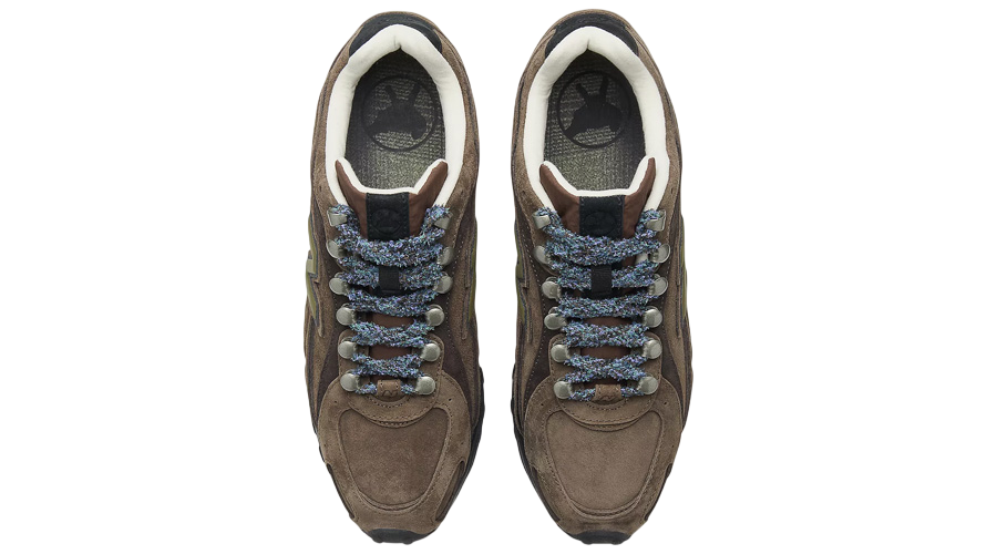 The upper arrives in rich brown suede, soft to the touch and easy on the eye. Olive green “N” logos sit on both sides, blending naturally with the earthy palette. Metallic hiking-style eyelets add a rugged twist, while fuzzy blue laces bring contrast and a slightly playful edge. If you like details that reveal themselves slowly, this pair delivers.