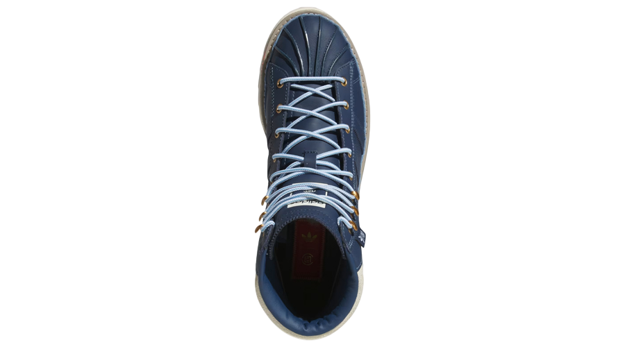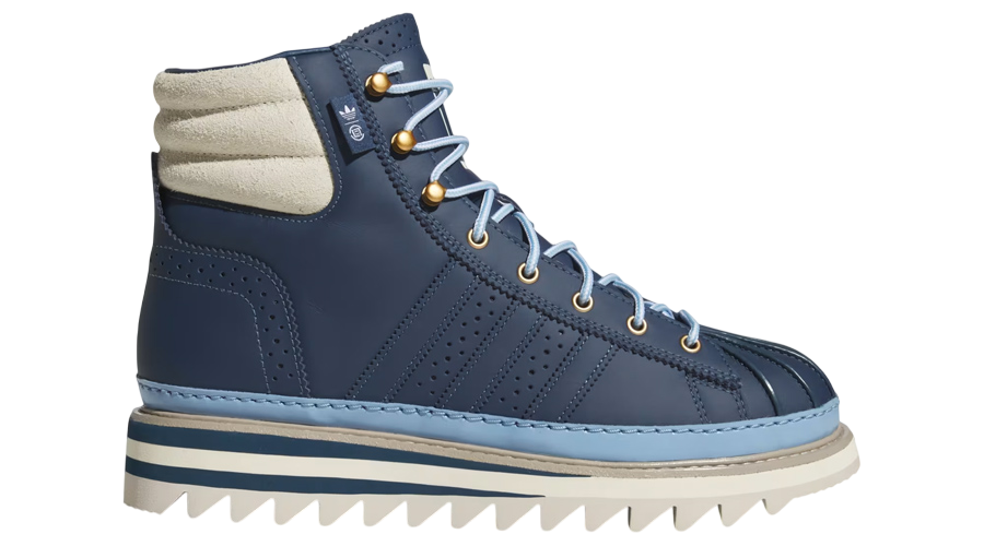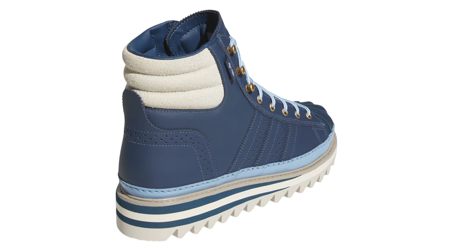 Metallic gold eyelets catch the light, contrasting against rope laces that nod to outdoor footwear. Around the ankle, a padded suede collar softens the profile and adds warmth, rounding out the shoe’s balanced mix of luxury and function. Small branding details — the Three Stripes and a foil tongue label — keep the Originals heritage visible but understated.