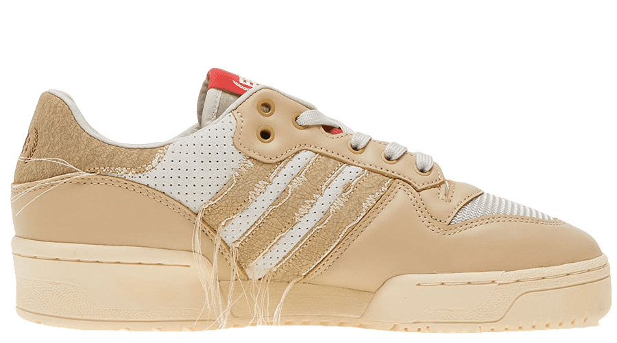 The design of this special edition sneaker features a minimalist color scheme, enhanced by bold red accents for a distinctive look. It combines the traditional leather upper of the original Rivalry with synthetic materials for enhanced comfort, while the chunky sole adds a trendy, bold silhouette and a subtle height boost. The iconic adidas stripes, reimagined with loose threads, offer an aged yet fashionable touch.