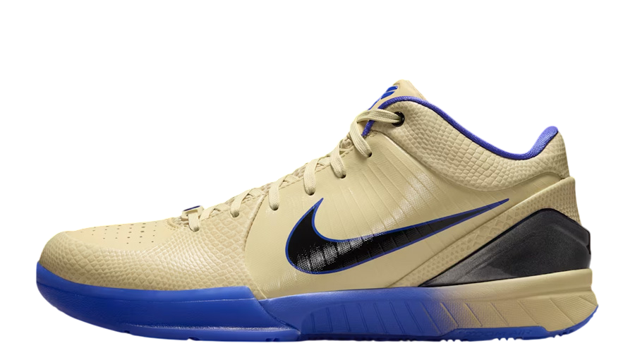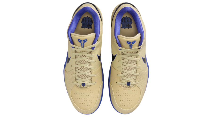 Cream and deep royal blue split the upper straight down the middle, mirroring the 2023–24 third jersey worn on pitch. The bold contrast sets the tone, with the iconic Kobe sheath logo sitting front and centre on the tongue, backed by Persian Violet and Team Gold accents. Nike finishes off the tribute with both of Kobe’s jersey numbers—8 and 24—stitched on the heels, making the connection to his Lakers legacy crystal clear.