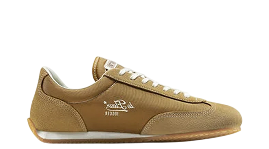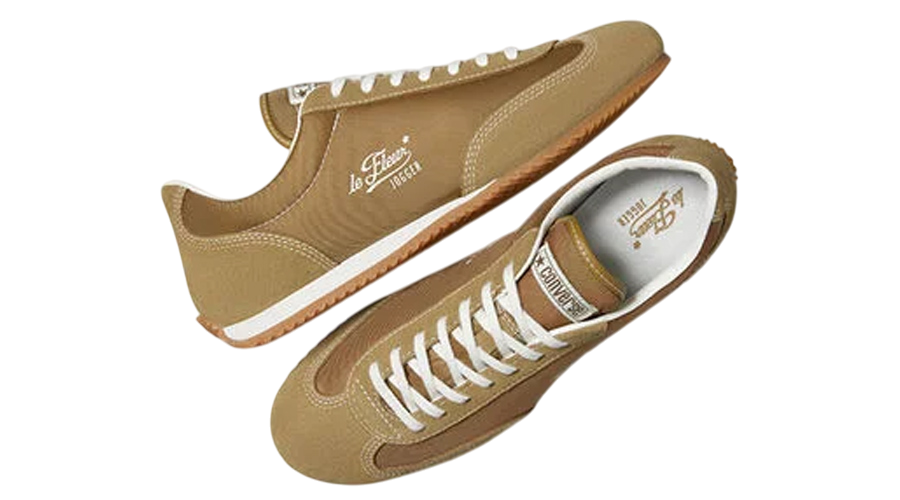 The upper comes dressed in olive brown nylon, contrasted by hairy suede panels that wrap around the toe, heel, and eyestays. A subtle pop arrives through the signature “le FLEUR JOGGER” branding stitched on the sidewalls and printed inside the sockliner. Converse’s classic woven tongue label holds its place, reinforcing the silhouette’s throwback roots.