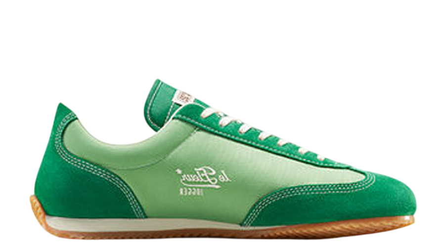 The upper combines light green nylon with hairy suede overlays across the toe, heel, and eyestay, giving it a distinct texture while staying true to the vintage build. The classic nylon tongue features woven Converse branding, while the “le FLEUR JOGGER” label on the sidewall adds a bespoke finish, replacing the traditional branding with a more personal touch.