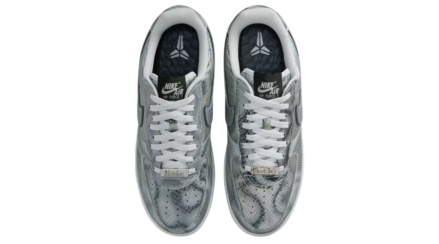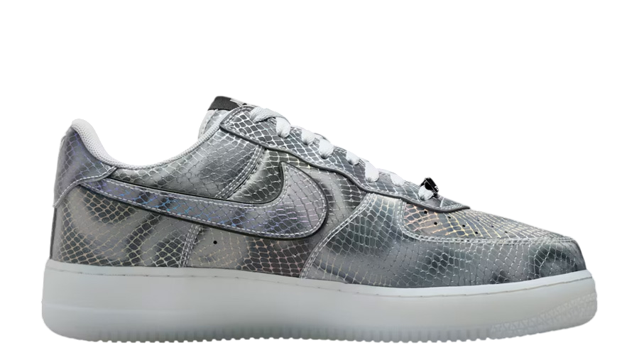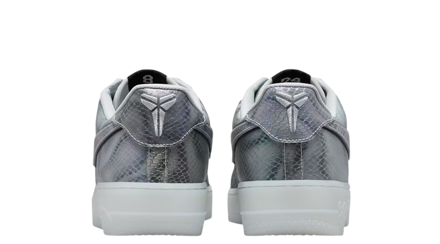The Kobe x Nike Air Force 1 Low “Lenticular” brings a look that shifts each time the light hits it. The silver upper carries a lenticular finish that moves through shades of purple, gold, and black, giving the shoe an almost liquid feel. It sits over a semi-translucent sole, keeping the whole build bright and smooth from every angle.