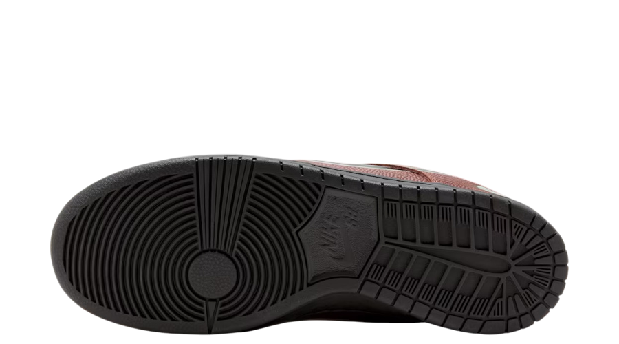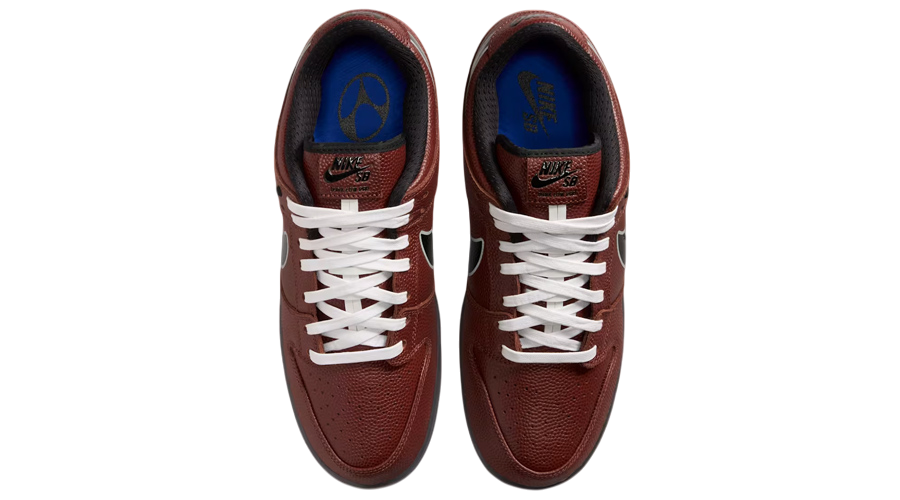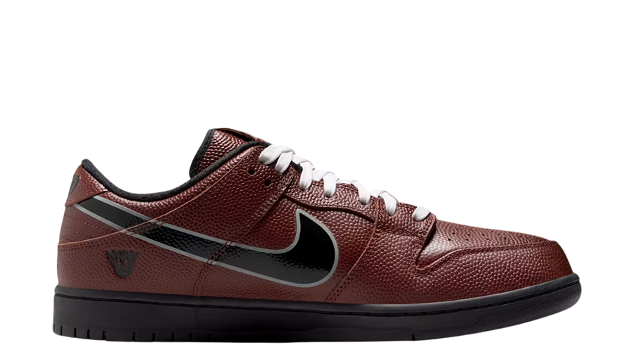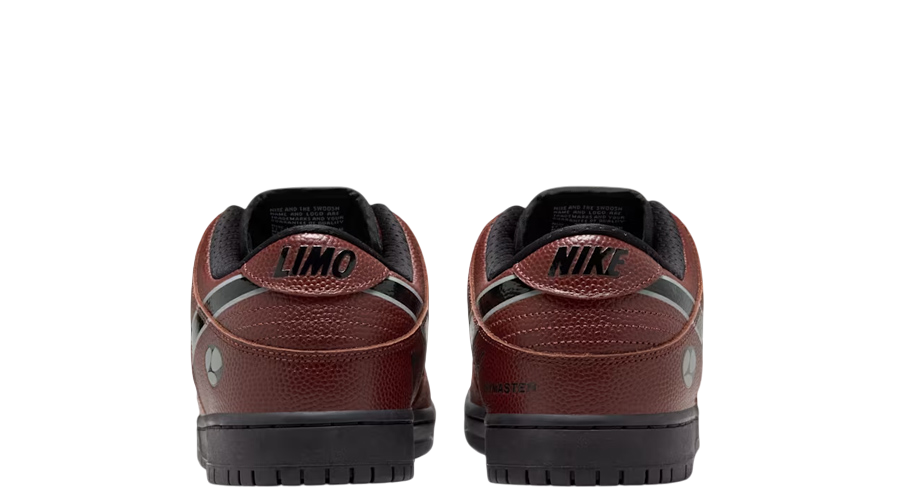The Limosine Skateboards x Nike Dunk Low SB “Football” reimagines one of Nike SB’s most iconic silhouettes with a playful yet authentic nod to American football. Instead of sticking to standard leather or suede, the upper comes dressed in a pebbled brown leather that mimics the texture of a classic football. This instantly sets the tone, making the sneaker feel both literal and tongue-in-cheek. To drive the theme further, the tongue features an embossed crossed lace detail, resembling the stitching found on a ball.