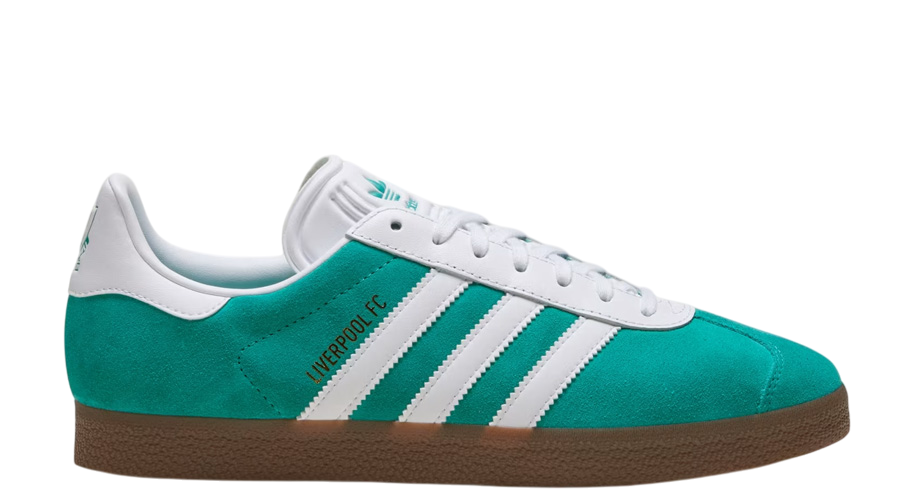 The Liverpool FC x adidas Gazelle “Third Kit” celebrates the reunion of two icons: the Trefoil and the Reds. This terrace-ready trainer reworks the timeless Gazelle silhouette in a rich green suede upper, directly inspired by the club’s third kit. Clean white leather 3-Stripes, eyestays, and heel tabs bring sharp contrast, while a golden “Liverpool FC” callout on the lateral panel makes the link unmistakable. The legendary liver bird crest sits proudly at the heel, matched with an embossed Trefoil on the tongue for a finish rooted in heritage.