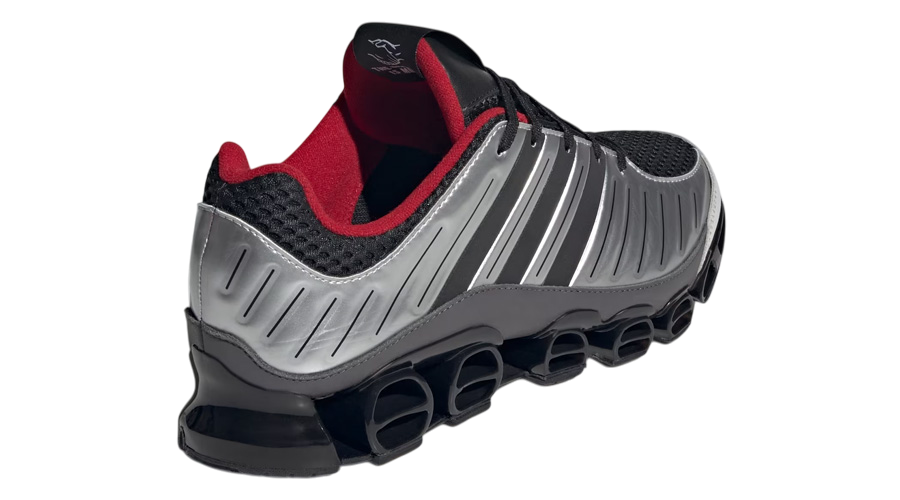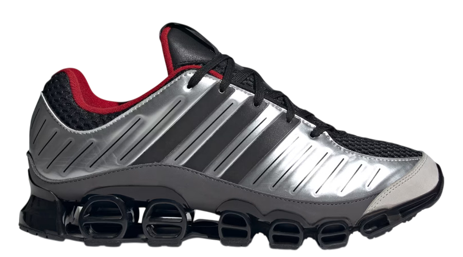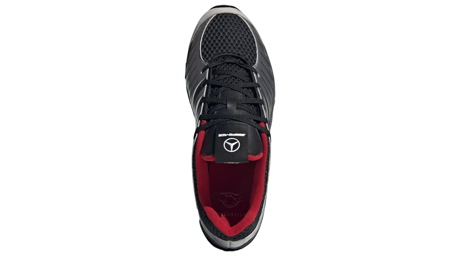 The upper combines chrome silver panels with breathable black mesh underlays, balancing visual edge with comfort. Gloss black Three Stripes slice across the side, framed by sturdy support pods for stability. AMG branding takes pride of place throughout, from co-branded insoles in vivid red to a stamped tongue tab that echoes the shoe’s name. The bold metallic finish nods directly to AMG’s track-ready machines, while the fiery lining injects a sharp burst of colour.