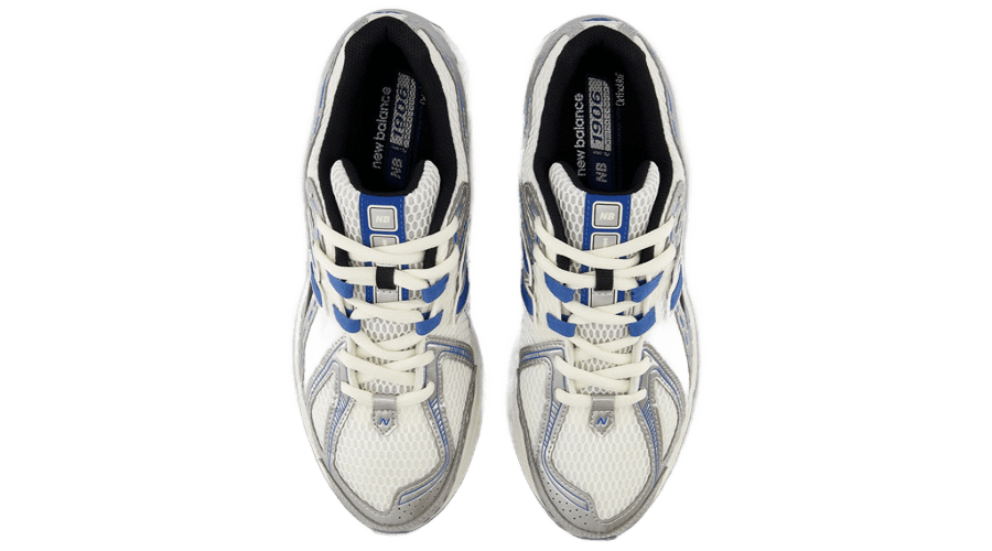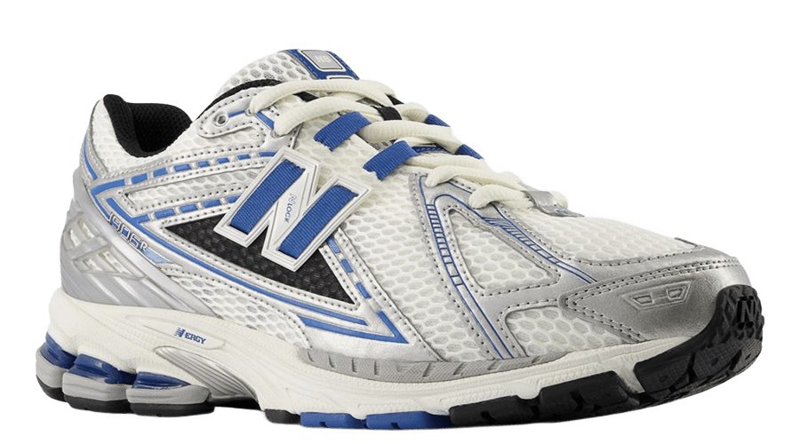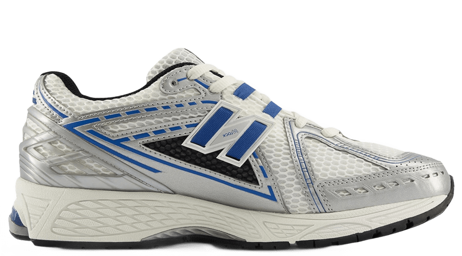 Featuring a breathable white open mesh upper, the 1906R ensures both comfort and a stylish look. Metallic silver leather overlays add a fashionable flair, enhancing the sneaker’s durability and making it a standout piece in any collection. The vibrant blue accents on the quarter, the iconic “N” logos, the lace loops, and the N-Ergy midsole pods inject a lively pop of colour, creating a striking contrast with the white and silver base.